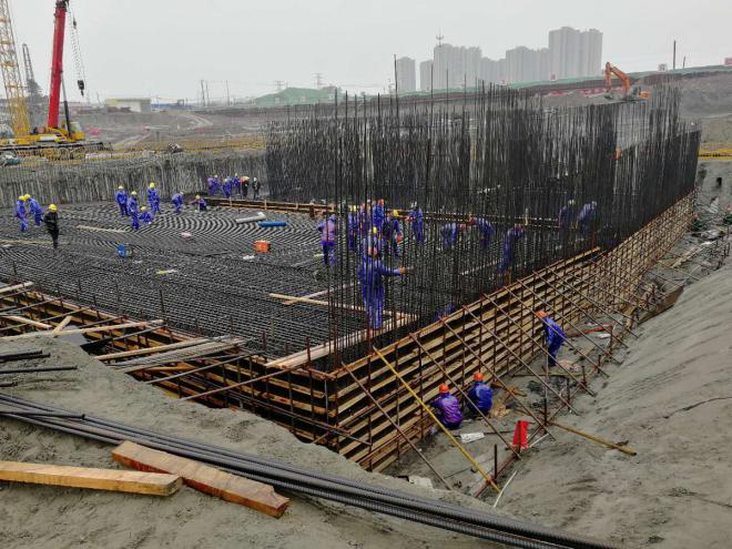 因為水利工程的特殊性,通呂運河水利樞紐工程必須在5月底主汛期來臨前完成水下部分施工,實現通水目標,搶抓工期成為貫穿整個施工過程的關鍵詞。自開工以來,現場最多的天氣便是下雨,據統(tǒng)計,自12月以來,雨水天氣達51天。為了確保通水目標按期實現,以及年底前完成主體工程計劃任務,在連續(xù)下雨、前期因清淤困難減緩了施工進度等不利情況下,自主體基坑開挖后,項目部便開始積極組織工人加班加點,沒有過絲毫的放松和懈怠,在參建各方的一致努力下,最終將原計劃于2月25日澆筑的泵站底板提前到了2月16日實施,從而為后續(xù)施工爭取到了更多的機動時間。目前節(jié)制閘1#、2#、3#底板及泵站已澆筑完成,待泵站工程搶出地面后,最后澆筑節(jié)制閘4#底板,進而完成主體基面以下部分施工。目前現場施工人員接近三百人,我們搶抓有利天氣,有序進行土方、管樁、水泥攪拌樁、主體結構鋼筋、模板等平行施工作業(yè),工作面全面展開,后續(xù)總體施工進度已處于可控狀態(tài),我們向著順利完成水下驗收的目標又邁出了堅實有力的一步。